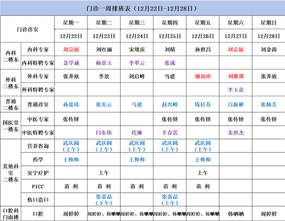 门诊排班表(12.22-12.28)