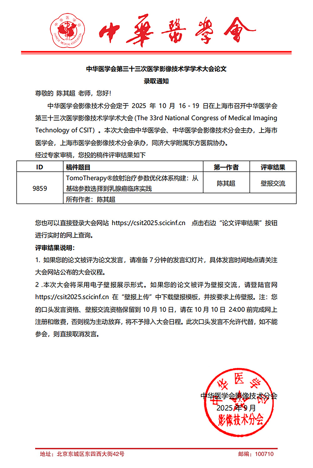 10月16日-19日,由中华医学会影像技术分会举办的中华医学会第三十三次医学影像技术学学术大会在上海市召开。济宁肿瘤医院放射治疗室主任陈其超所撰写的论文《TomoTherapy®放射治疗参数优化体系构建:从基础参数选择到乳腺癌临床实践》,入选“壁报交流”展示,标志着医院在该领域的学术探索获得国家级医学会认可。